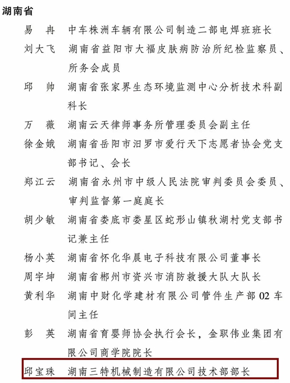 為表彰先進、樹立榜樣,進一步引領(lǐng)和激勵廣大婦女堅定不移聽黨話、跟黨奮進新征程,豪情滿懷、意氣風(fēng)發(fā)投入推進中國式現(xiàn)代化的偉大實踐,日前,全國婦聯(lián)決定授予10人全國三八紅旗手標(biāo)兵稱號,298人全國三八紅旗手稱號,授予199個單位全國三八紅旗集體稱號,其中,來自桃源的湖南三特機械制造有限公司技術(shù)部部長 邱寶珠 獲得全國三八紅旗手榮譽。